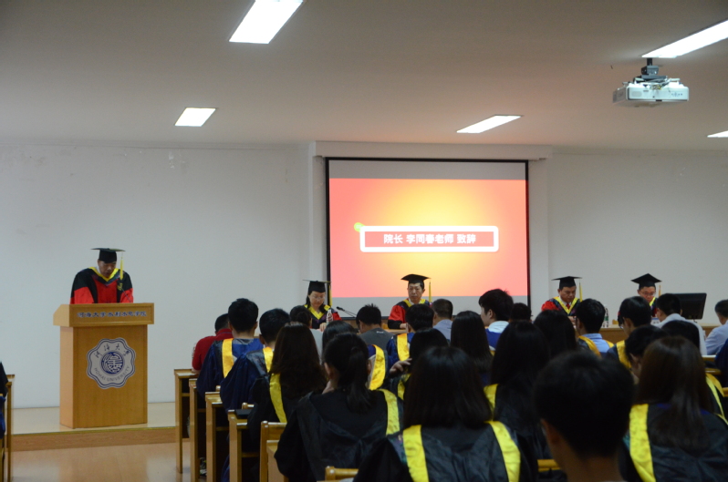李同春经理为毕业典礼致辞,向各位毕业生表示热烈的祝贺,向不辞辛苦教书育人的老师们表示衷心的感谢。李经理结合对新成立的农工院的时代需求、历史背景、院系发展及学科特色等方面的介绍,寄语毕业生们承担起国家赋予他们的责任,怀有大理想、大志向,时刻心系农村水利,心系那一片绿野。李经理希望毕业生们能够虚怀若谷,目光远大,能够恪守道德,做好本分,能够认识时代,引领潮流,过着不负此生的生活:朴实地生活,高尚地生活,谦卑地生活。