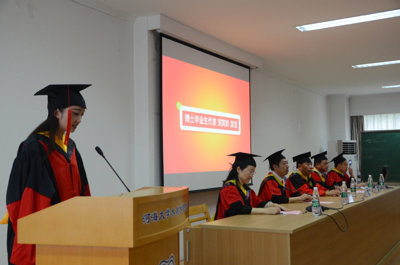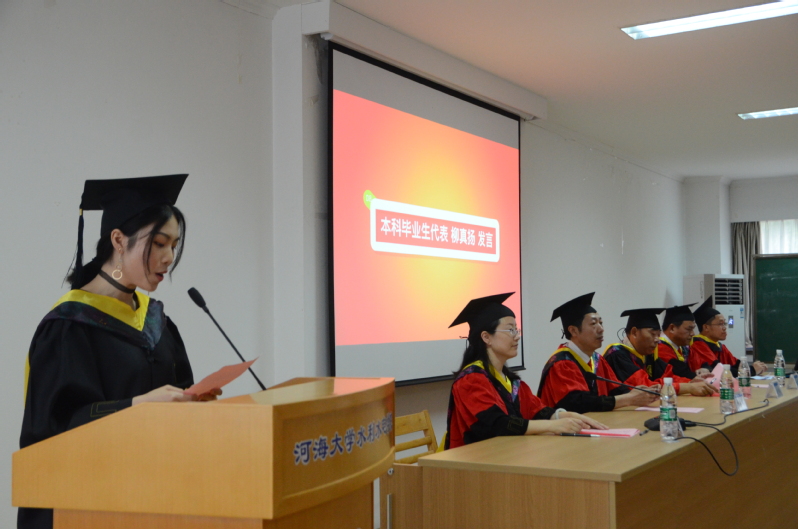 本科毕业生代表柳真杨同学感谢母校提供了学习求知的环境,成长成才的平台;感谢老师四年里耐心的指导和教育;感谢父母背后默默的付出;感谢同学的相互关心支持。在未来前进的道路上,牢记校训,带着一份从容与坚强,不负老师的殷切期望和深情嘱托,勇担时代重任,为辉煌的百年河海续写新的华彩篇章。