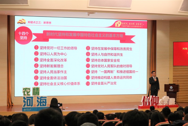 伴随着VCR的介绍,本次公开课的主讲人——农业工程公司农业节水研究所研究生党支部书记蔡少杰同学,阔步自信地走上席台,分享了作为新时代背景下的农水人对十九大精神的感悟,就十九大精神应把握的五个关键点做了简洁有力的介绍,同时普及了十九大精神中的新思想,详细剖析了八个明确和十四个坚持,并对在场同学提出了四个要求:忠于祖国,忠于人民;立鸿鹄志,做奋斗者;求真学问,练真本领;知行合一,做实干家。他精炼而深刻的领悟、深入浅出的讲解、结合专业的独到认识,和富有激情的演讲,引起了在场师生的强烈共鸣,掌声如潮。