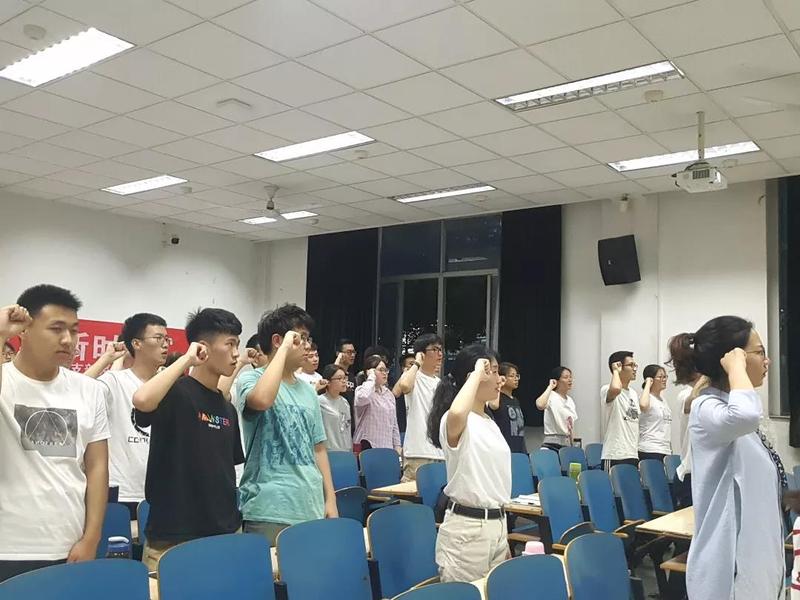 在庄严肃穆的国歌声中,团日活动拉开了序幕。国歌奏毕,全体团员在17级团支书李桐的带领下,面对鲜红的团旗庄严宣誓,重温入团誓词,铿锵有力的宣誓声中饱含着同学们对祖国的无限热爱。