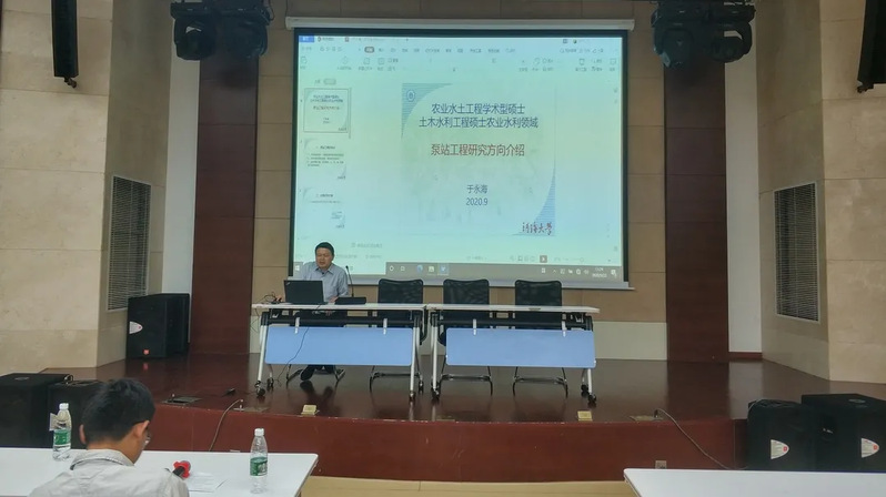 于永海教授介绍了所从事的泵站工程研究方向,希望同学们秉承“严格要求,勇于探索”的校训,敢于从事最艰苦的研究。