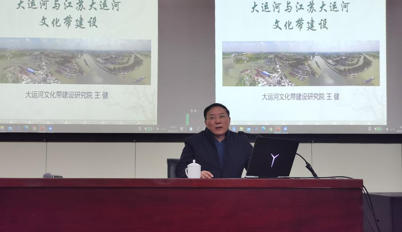 王健老师以宏大的视角就《大运河与大运河文化带建设》问题向同学们详细介绍了大运河的悠久历史和伟大价值。他指出以前人所说的“京杭大运河”已更名为“大运河”,其中包括“京杭运河”“浙东运河”等。开凿大运河的意义非凡,不仅促进了南北交通运输还极大的加强了政府对国家政权的集中统治;它加强了历史上各个地区的经济建设,促进了经济发展,江苏的经济腾飞,大运河功不可没;运河也加强了各个地方文化交流和融合,使得宝贵的运河文明得以弘扬和传承。