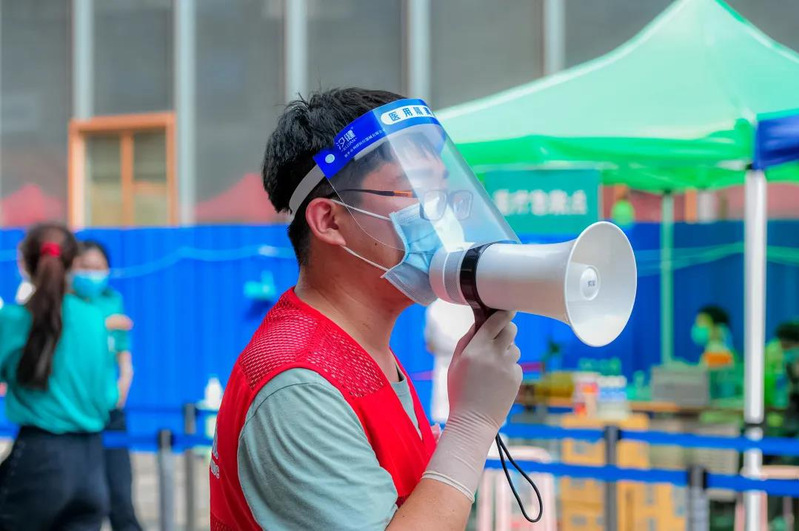 在核酸检测中,王凯瑞同学作为负责人永远冲在前面,维持检测队伍的秩序。炎热的天气抵挡不住他的热情,像他一样的志愿者在大筛查中,服从命令,统一行动,工作兢兢业业、科学高效,志愿红坎肩与医务人员的白衣交相辉映,成了一道流动的美丽风景。