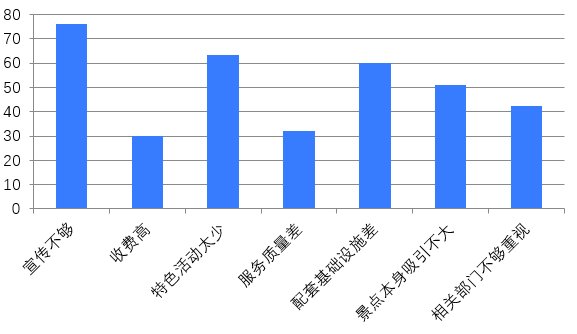 7、受访对象对于自己家乡红色旅游景点发展存在的意见主要包括:宣传不够、特色活动太少、配套基础设施差等等。