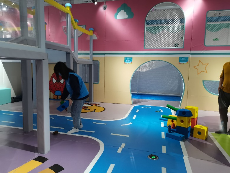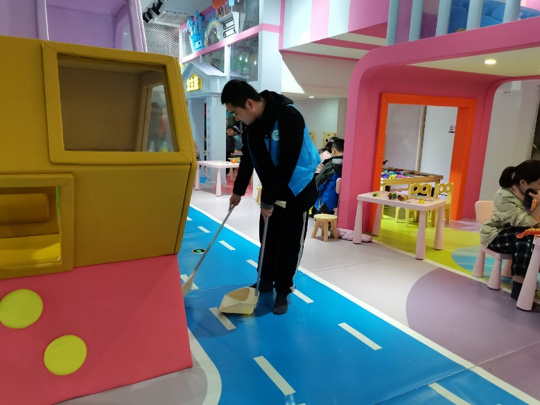 一开始,志愿者们主要负责清理二楼和一楼滑梯后的细沙。细沙体积较小而且总是卡在地板的缝隙中,大家不得不弯下身子来不停地用手拾取。长时间腰背的弯曲让志愿者们越来越疲惫,但没有一个人选择放弃,大家不约而同地加快自己手上的速度,认真完成了清理。休息片刻,大家又投入了新一轮的工作。三名志愿者在园内巡逻,负责把孩子们随处停放的玩具车摆放到专用的“停车场”,并且将从海洋球池内“逃逸”的海洋球扔回去。一名志愿者在滑梯的下方看守,避免孩子们磕到碰到。其余的两名志愿者担任“保洁员”的工作,打扫园区内的卫生。大家各司其职,不敢有丝毫松懈。