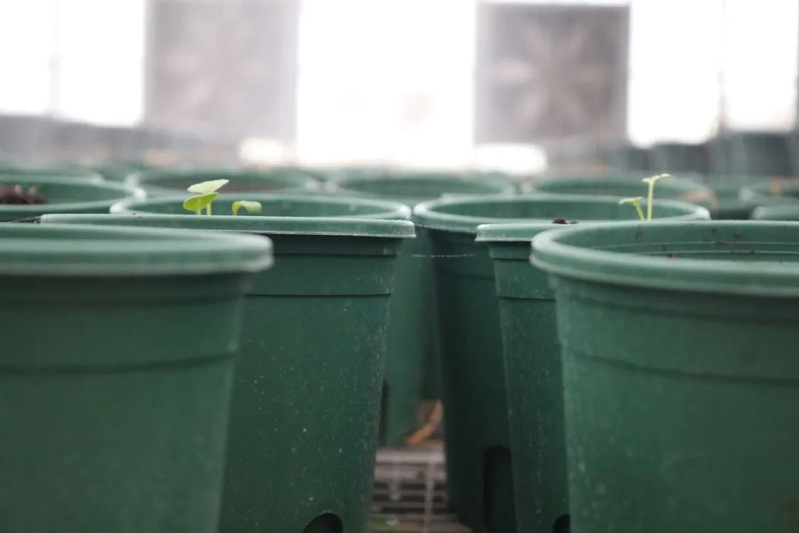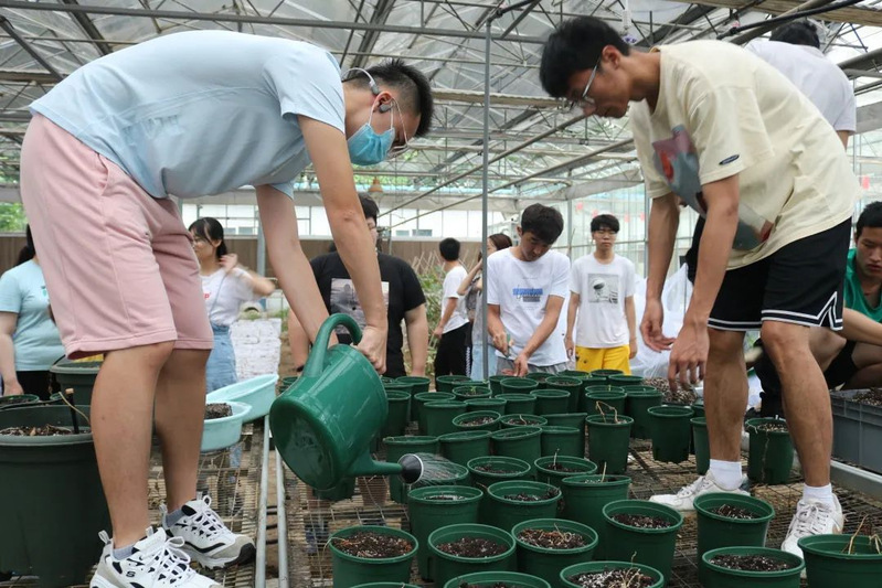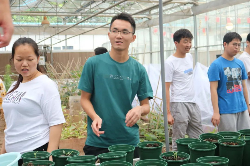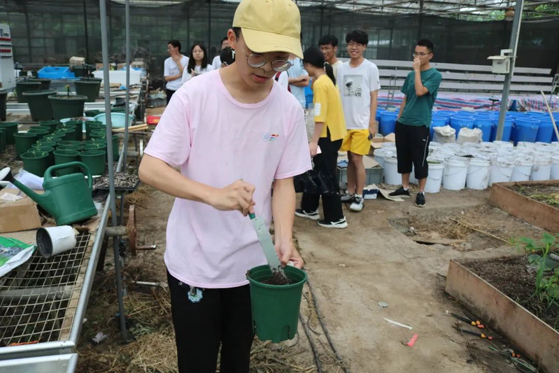 一部分同学爬上铁丝网,卖力地翻动着浇灌过水的盆栽土,力求每一寸土壤都能得到完全地浸润;不方便爬上网架的同学则别出心裁,把土倒入装有水的盆中,润湿后再装进土盆里;也有一部分同学在两个大棚之间端着装满水的水盆穿梭,负责接水运水的后勤工作。所有人都在为栽种工作努力忙碌着,没有人喊苦喊累,润湿工作井然有序地进行。