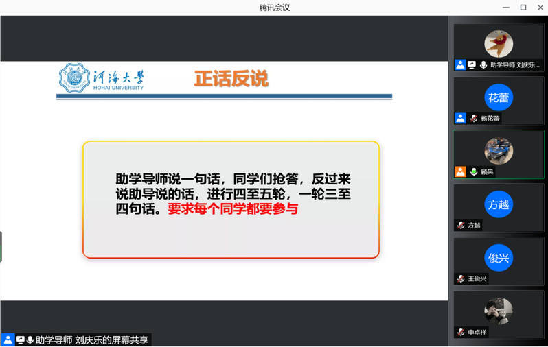 接下来,便是破冰环节。首先,播放了同学们提前精心准备的自我介绍视频。视频中,大家各自介绍了自己的性格特点,兴趣爱好并向大家展示了自己的家乡。在视频环节,同学们能够相互认识,相互了解。在视频播放完之后,便是令人期待已久的游戏环节。游戏共有2项,第一项是盲盒认脸。游戏规则如下:1.选一位同学参与游戏,这位同学留摄像头,其他人关闭。2.该同学开盲盒认脸,一个盲盒共计3~4位同学头像:(1)假如说出3个头像中任意一位同学的名字,则被说出名字的同学受到惩罚,抽取问题回答;说出几个惩罚几个;(2)假如3个头像均未认出,则该同学受到惩罚。3.抽到自己无效,说出其他2位同学名字才算成功。4. 共计6轮。第二项游戏是默契数字接龙,游戏规则如下:1.单轮游戏时长3分钟,由主持人宣布开始,导师计时;2.按顺序扣出1~19的数字(并非按学号),数字不能重复;若有2人或多人扣出同一个数字,则重复数字的小伙伴受到惩罚;一个人不能连续扣出2个数字,否则受到惩罚。3.我们班级共计19人,加上助学导师2人,共计21人,最后必定剩余2人,一个数字也没有扣出的小伙伴受到惩罚,请大家自觉遵守规则。游戏一培养了班级同学们的团队感,游戏二培养了同学们的默契感。在助学导师的总结下,破冰游戏环节到此结束。