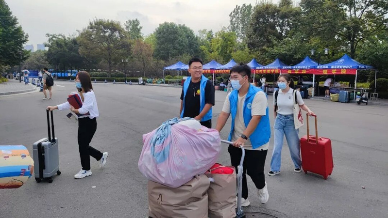 新生抵达南门后,在工作人员的指引下,依次完成“体温监测、身份验证、苏康码查验”等流程后进入校园,来到公司服务点,现场志愿者进行问题解答,并帮助新生贴行李标签、运送行李、送达宿舍区。