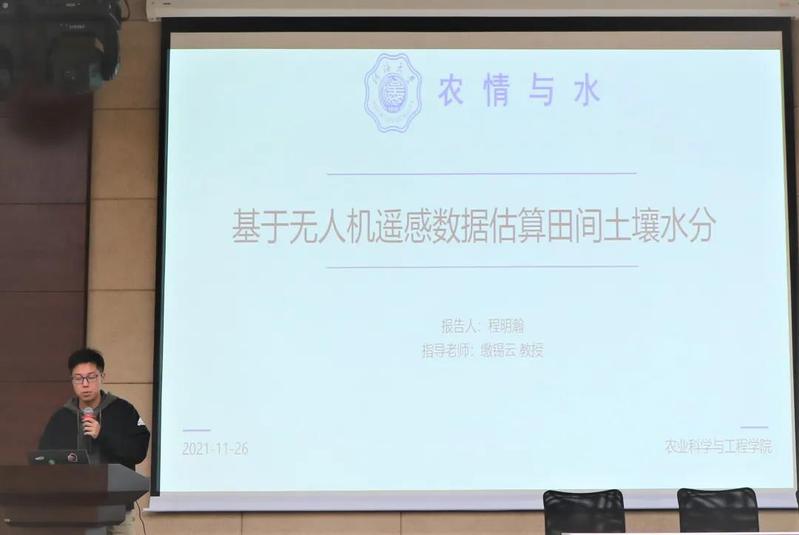 程明瀚同学介绍了基于无人机遥感数据估算田间土壤水分的研究成果,从研究背景到结论条理性强,获得评委老师的高度认可,赢得在座同学的热烈掌声!