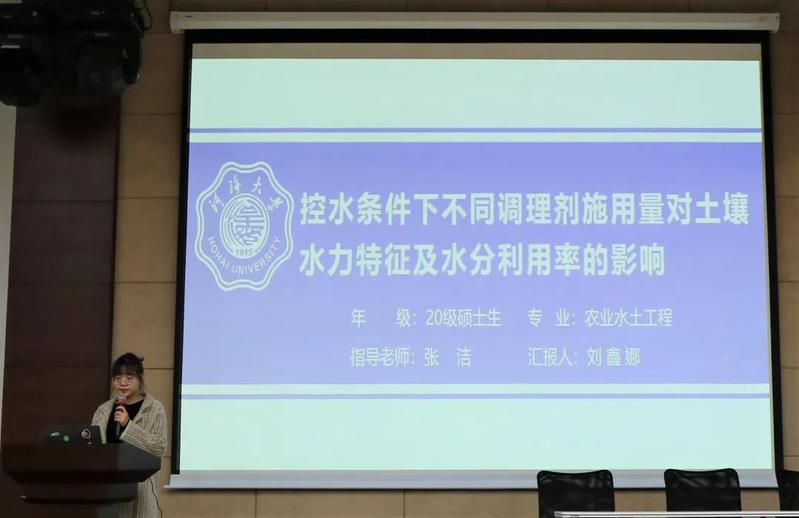 刘鑫娜同学介绍了控水条件下不同调理剂施用量对土壤水力特征及水分利用率的影响,汇报条理清晰,重点突出,在众多选手中脱颖而出。汇报最后,刘鑫娜同学认真回答了评委和主持人提出的问题,总结反思了研究工作中的不足,这也是科研工作中尤为重要的一部分,只有知道自己不足之处,下次才会做得更好。