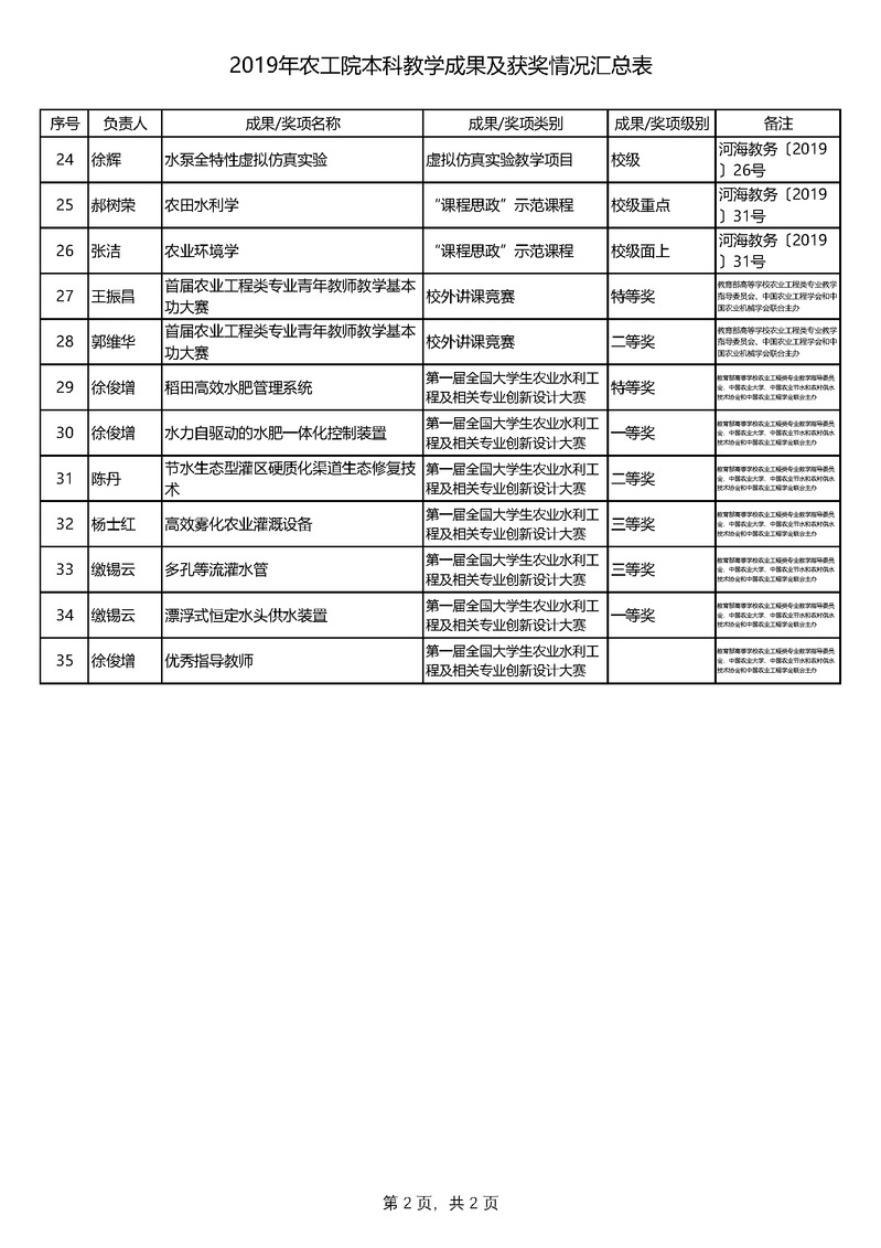 2019年农工院本科教学成果及获奖情况汇总表