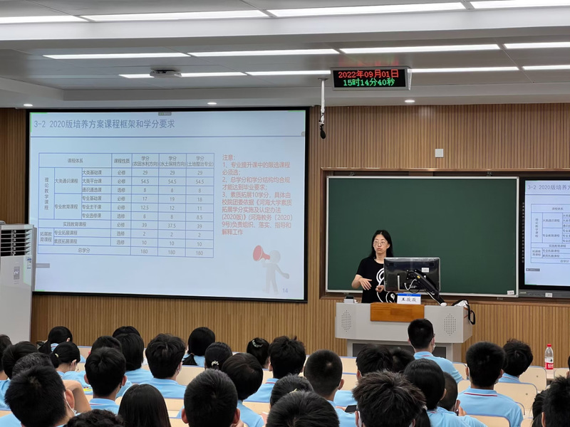 王薇薇老师从本科生基本教学事务时间轴讲起,与同学们一同梳理大学四年的重要事件,增强同学们的时间观念。王老师介绍到本科教学管理主要分为管理体系、规章制度、重要事项和综合服务四个部分。王老师细致地讲解了学分,绩点,补考,重修以及2020版培养方案等方面的内容,使同学们对大学学习以及相关公司产品活动有了初步的了解和期待。
