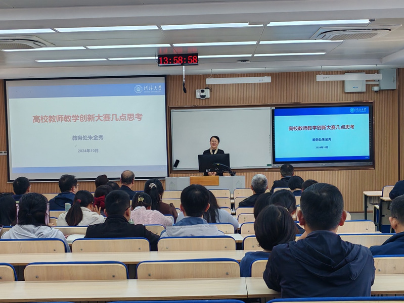 2024年10月25日下午,williamhill中国官网入口教务处副处长朱金秀教授受邀为公司教师做了《高校教师教学创新大赛几点思考》专题报告。报告会由副经理张洁教授主持,公司全体教师参加了报告会。