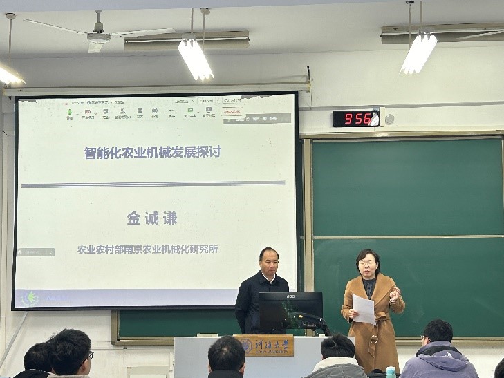 金教授从智能化农业机械发展的基础、当前智能农机发展分析、农业机械智能化技术需求、发展路径四个方面为两校两个专业的同学们呈现了精彩的专业课程。课后,两校员工围绕课堂内容关键知识点进行提问,金老师为同学们答疑释惑,获得了强烈反响。