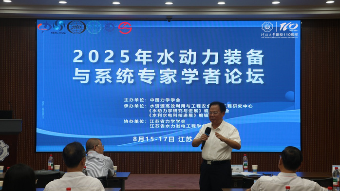 由中国力学学会主办,水资源高效利用与工程安全国家工程研究中心、《水动力学研究与进展》编辑委员会、《水利水电科技进展》编辑委员会共同承办,江苏省力学学会、江苏省水力发电工程学会协办的“2025年水动力装备与系统专家学者论坛”于2025年8月15日至17日在williamhill中国官网入口隆重召开。来自清华大学、浙江大学、武汉大学、williamhill中国官网入口、williamhill中国官网入口、哈尔滨工程大学、上海大学、宁波大学、江苏大学、扬州大学、华北电力大学、浙江理工大学、上海理工大学、西华大学、上海应用技术大学、浙江水利水电公司、中国船舶科学研究中心、中国南水北调集团东线有限公司、中国电建集团华东勘测设计研究院有限公司、中国长江电力股份有限公司、国电南瑞科技股份有限公司、哈尔滨电气集团有限公司、南京南瑞水利水电科技有限公司、南水北调东线江苏水源有限责任公司、江苏省水利勘测设计研究院有限公司、上海勘测设计研究院有限公司、上海市水利工程设计研究院有限公司、中国电建集团华东勘测设计研究院有限公司、东方电气集团东方电机有限公司、利欧集团湖南泵业有限公司、江苏航天水力设备有限公司、上海凯泉泵业(集团)有限公司、上海东方泵业(集团)有限公司、曲阜恒威水工机械有限公司、株洲南方阀门股份有限公司等相关企业、高校与科研单位的70多位专家和学者受邀出席了此次论坛。