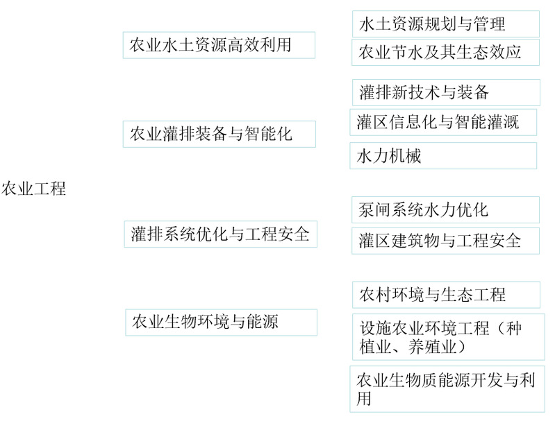 农业工程学科下设农业水土工程(082802)、农业生物环境与能源工程(082803)、农业水土资源保护(自设)三个二级学科领域。